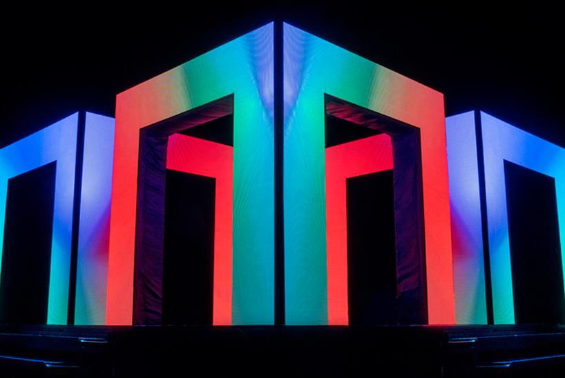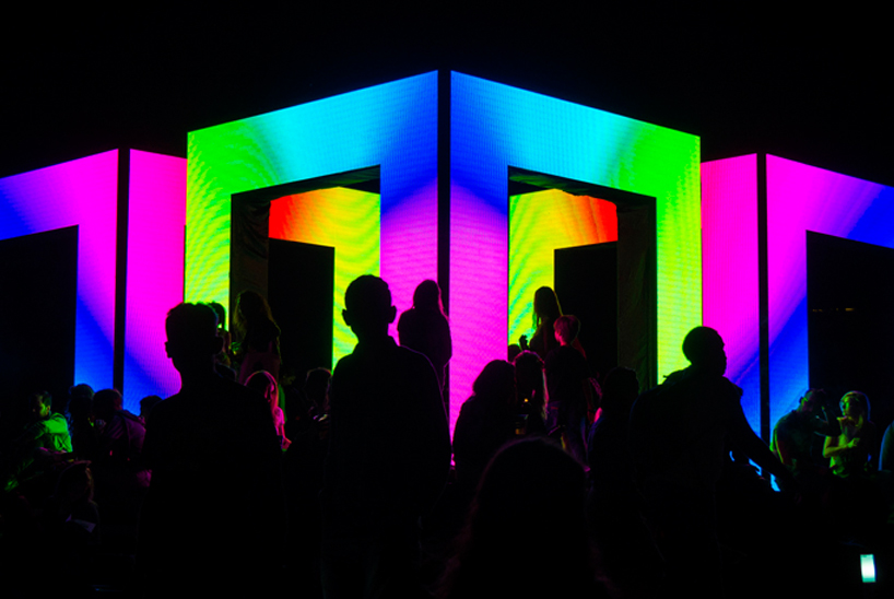 墨尔本艺术家kit webster长期在多领域的实践让他设计出了作品axiom,一个用70多万个LED灯做成的灯光大厦。它的外形为3个对称的拱门,70多万个LED灯可以变幻出一系列不同的动画效果,以展现出拱门的轮廓。艺术家将艺术和设计跟科技结合在一起该装置和物理概念息息相关,被认为是技术和环境的接口。